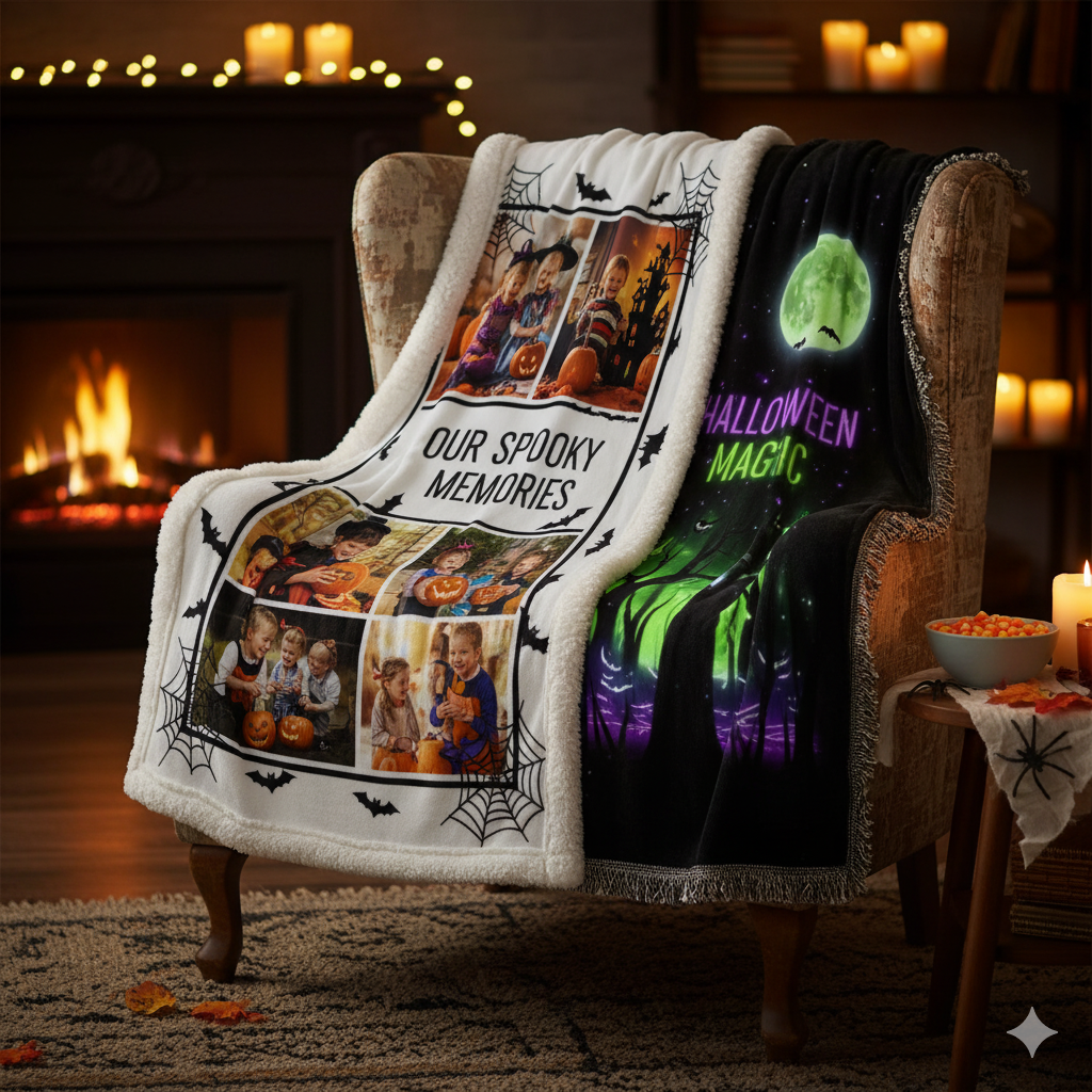 Custom photo blankets are a cosy way to celebrate Halloween while also doubling as décor. Printed with family costumes or pumpkin patch photos, they’re great for snuggling during movie nights or draping over sofas to create an autumn vibe.