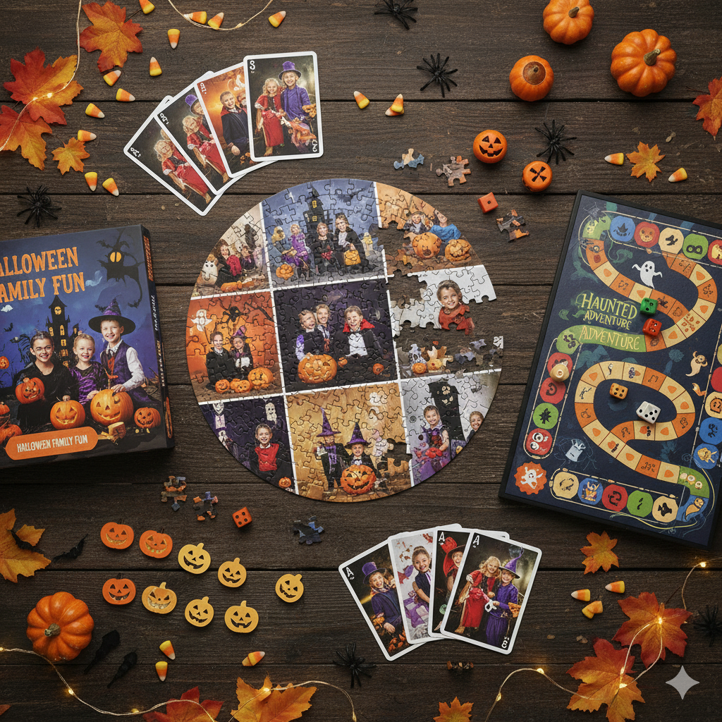 Personalised photo puzzles are fun Halloween activities that turn your favourite photos into entertainment. Use a group costume photo or spooky portrait to create a puzzle that keeps kids and guests engaged during the celebrations.